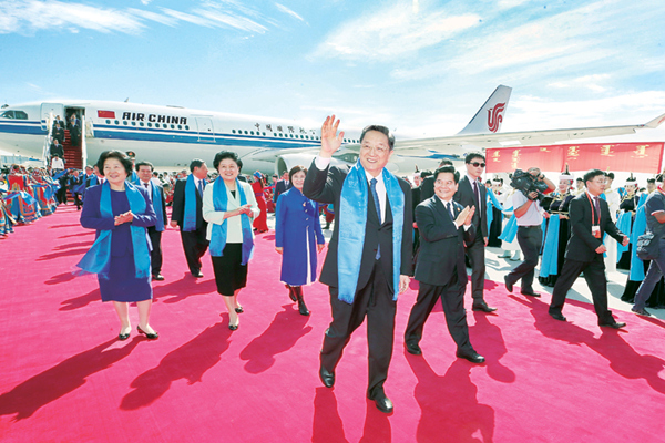 上午10時許,當中央代表團乘坐的專機平穩(wěn)降落時,等候在停機坪上的800多人的歡迎隊伍爆發(fā)出熱烈掌聲和歡呼聲,身穿鮮艷民族服裝的各族群眾載歌載舞,向代表團表示歡迎。俞正聲走出飛機艙門,向歡迎群眾揮手致意。