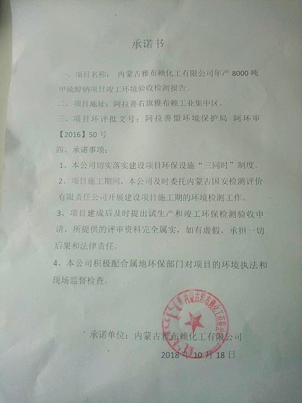 內(nèi)蒙古雅布賴(lài)化工有限公司年產(chǎn)8000噸甲硫醇鈉項(xiàng)目竣工環(huán)境驗(yàn)收檢測(cè)報(bào)告的公示
