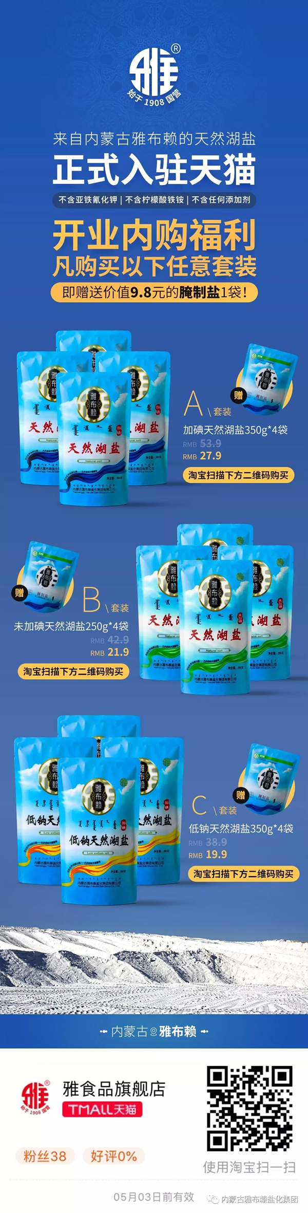 經(jīng)過眾多人員的縝密策劃和精心準(zhǔn)備,內(nèi)蒙古雅布賴鹽化集團(tuán)有限公司電商公司通過京東的層層嚴(yán)格審核,雅鹽天貓旗艦店于4月1日隆重開業(yè)。自此,雅鹽食用鹽、洗滌鹽系列8個(gè)單品全部上線銷售,分別為:大青鹽(320g)、低鈉天然湖鹽(350g)、未加碘天然湖鹽(250g)、天然湖鹽(350g)、腌制鹽(400g)、精制鹽(400g、2500g)、果蔬洗滌鹽(320g)。 現(xiàn)在,消費(fèi)者只需在淘寶輸入“雅布賴鹽”、“雅食品旗艦店”或使用淘寶掃描上圖二維碼,即可找到由內(nèi)蒙古雅布賴鹽化集團(tuán)有限公司生產(chǎn)的高品質(zhì)、純天然湖鹽,輕松免郵費(fèi)購(gòu)買(偏遠(yuǎn)地區(qū)郵費(fèi)也不高)快遞到家,目前試營(yíng)業(yè)階段下單購(gòu)買還有好鹽相送,多買多得。 雅布賴天然湖鹽具有以下特性: 產(chǎn)自世界地質(zhì)公園—巴丹吉林沙漠腹地,遠(yuǎn)離海洋污染,遠(yuǎn)離工業(yè)、城市、地下水等環(huán)境污染,摒棄井礦鹽、真空鹽使用化學(xué)品凈化鹵水工藝,采用傳統(tǒng)粉碎洗滌、純物理加工工藝,未添加任何化學(xué)品和亞鐵氰化鉀等抗結(jié)劑,鹵水是在四季分明的自然氣候條件下,利用嚴(yán)寒自然冷凍凈化,在高溫天氣下自然結(jié)晶而成,保持了原汁原味的特質(zhì),呈現(xiàn)出高品質(zhì)湖鹽本色。另外,天然湖鹽中伴生的鈣、鎂、鉀元素,能幫助人體中鈉離子快速排出,可有效降低高血壓患病風(fēng)險(xiǎn)。 好鹽無添加 才是真健康 歡迎大家選購(gòu)。 |