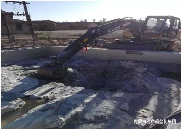 精鹽分廠鹵水池已經(jīng)持續(xù)使用了2年左右時(shí)間,沉積的淤鹽、泥沙較多,導(dǎo)致鹵水渾濁,造成鹽品水不溶物較高。因此,分廠組織部分黨員員工聯(lián)系反鏟、水車進(jìn)行了清理、清洗。