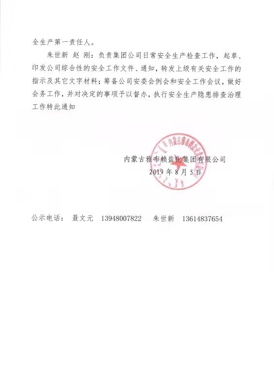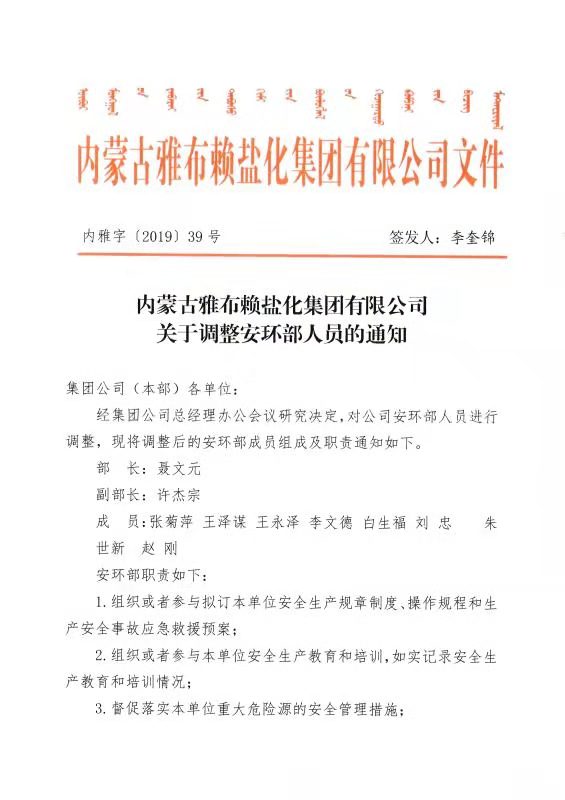 關(guān)內(nèi)蒙古雅布賴鹽化集團(tuán)有限公司于調(diào)整安環(huán)部人員的通知