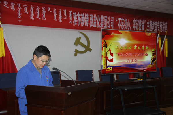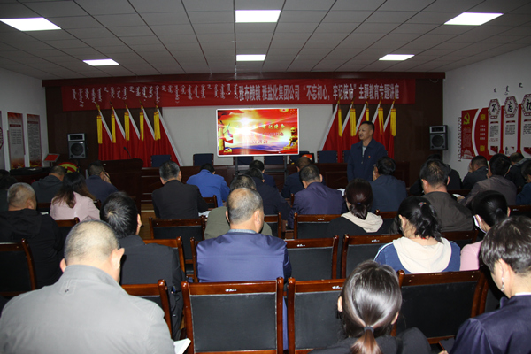 為扎實(shí)推進(jìn)公司“不忘初心、牢記使命”主題教育,根據(jù)阿右旗旗委主題教育領(lǐng)導(dǎo)辦要求和公司黨委《關(guān)于開展“不忘初心、牢記使命”主題教育實(shí)施方案》安排,2019年10月10日晚,公司黨委在五樓會(huì)議室舉辦“雅鹽先鋒”典型事跡宣講會(huì)。公司在家領(lǐng)導(dǎo)、中層干部、全體黨員、機(jī)關(guān)工作人員共70余人到場(chǎng)聆聽。宣講會(huì)由公司黨委委員、主題教育宣傳組組長(zhǎng)徐憲國主持。