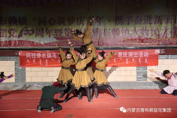 7月8日晚,阿右旗烏蘭牧騎走進(jìn)雅鹽化集團(tuán)公司,與企業(yè)聯(lián)合舉辦消夏暨慶祝雅鹽建場(chǎng)80周年文藝晚會(huì)。