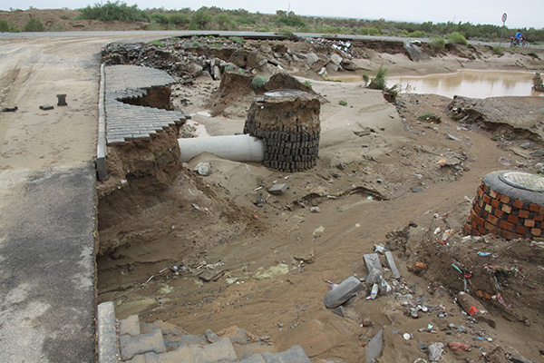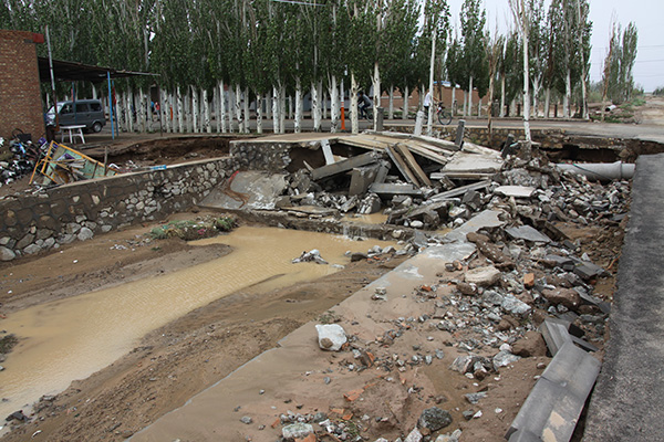 山洪來勢兇猛,小鎮(zhèn)唯一的防洪渠跨馬路部分被沖毀,鎮(zhèn)區(qū)馬路多處遭到破壞。